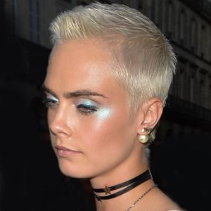 Кара Делевинь искусно жонглирует самыми смелыми трендами сезона. Экстремально короткий платиновый блонд плюс переливающаяся «пыльца» на веках — такой образ модель выбрала для одной из парижских вечеринок.