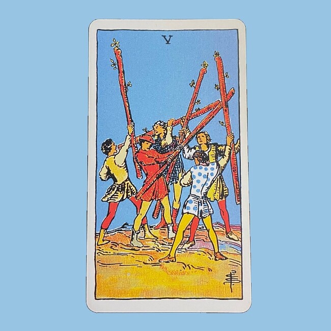 Пятерка ЖезловНикакой жизненный успех не приходит без борьбы: со своими страхами, соперниками, сложными задачами — не важно, с кем. Вам предстоит сразиться, даже случайная ссора влечет за собой возникновение живых и искренних отношений.