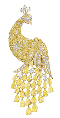 Время идет, с его ходом просыпается природа — и свои места на метках часов занимают украшения с природными мотивами. Брошь Mercury в виде жар-птицы, чье оперение — паве из желтых и бесцветных бриллиантов круглой огранки, а хвост — 33 (число с глубокими сакральными смыслами) бриллианта огранки «груша». Рядом с ней распускаются драгоценные бутоны колье Pasquale Bruni с центральными пятилистными цветками из празиолита и кварца фирменной огранки итальянского бренда. Словно в эдемском саду, есть здесь и змея — колье из желтого золота и круглых бриллиантов: два перекрещенных знака бесконечности образуют четырехлистник — вечный символ удачи.