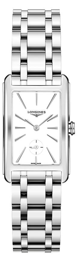 Искусно сочетая геометрические линии и плавные изгибы, коллекция Longines DolceVita отличается прямоугольным корпусом, вдохновлённым часами 1920-х годов. Модель оснащена матовым белым циферблатом и накладными индексами. Модель дополняет браслет из нержавеющей стали.