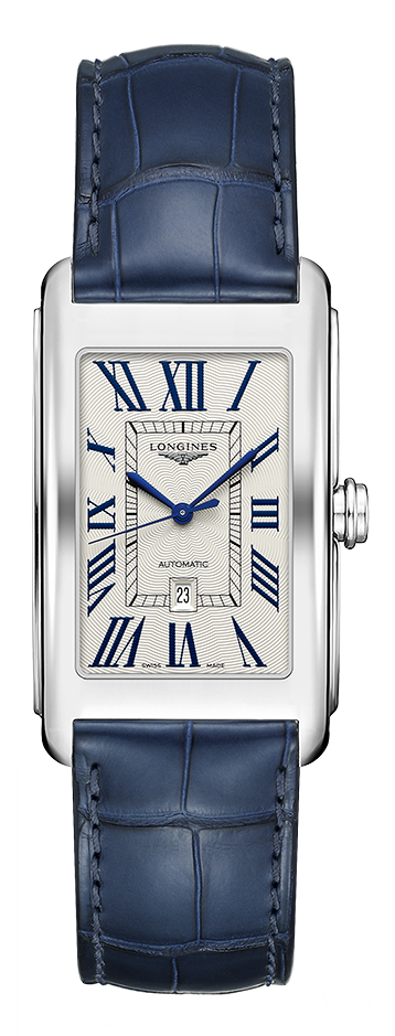 Искусно сочетая геометрические линии и плавные изгибы, коллекция Longines DolceVita отличается прямоугольным корпусом, вдохновлённым часами 1920-х годов. Модель оснащена циферблатом, выполненным в технике «flinqué» с нарисованными римскими цифрами. Модель дополняет кожаный ремешок синего цвета из кожи аллигатора.