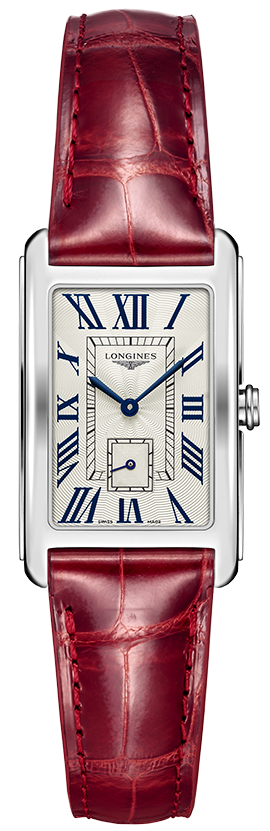 С момента появления на свет коллекция Longines DolceVita высоко несет знамя элегантности Longines во всем мире. Она призывает наслаждаться жизнью в стиле dolce vita. Модель оснащена циферблатом, выполненным в технике «flinqué» с нарисованными римскими цифрами. Модель дополнена браслетом из кожи аллигатора красного цвета.