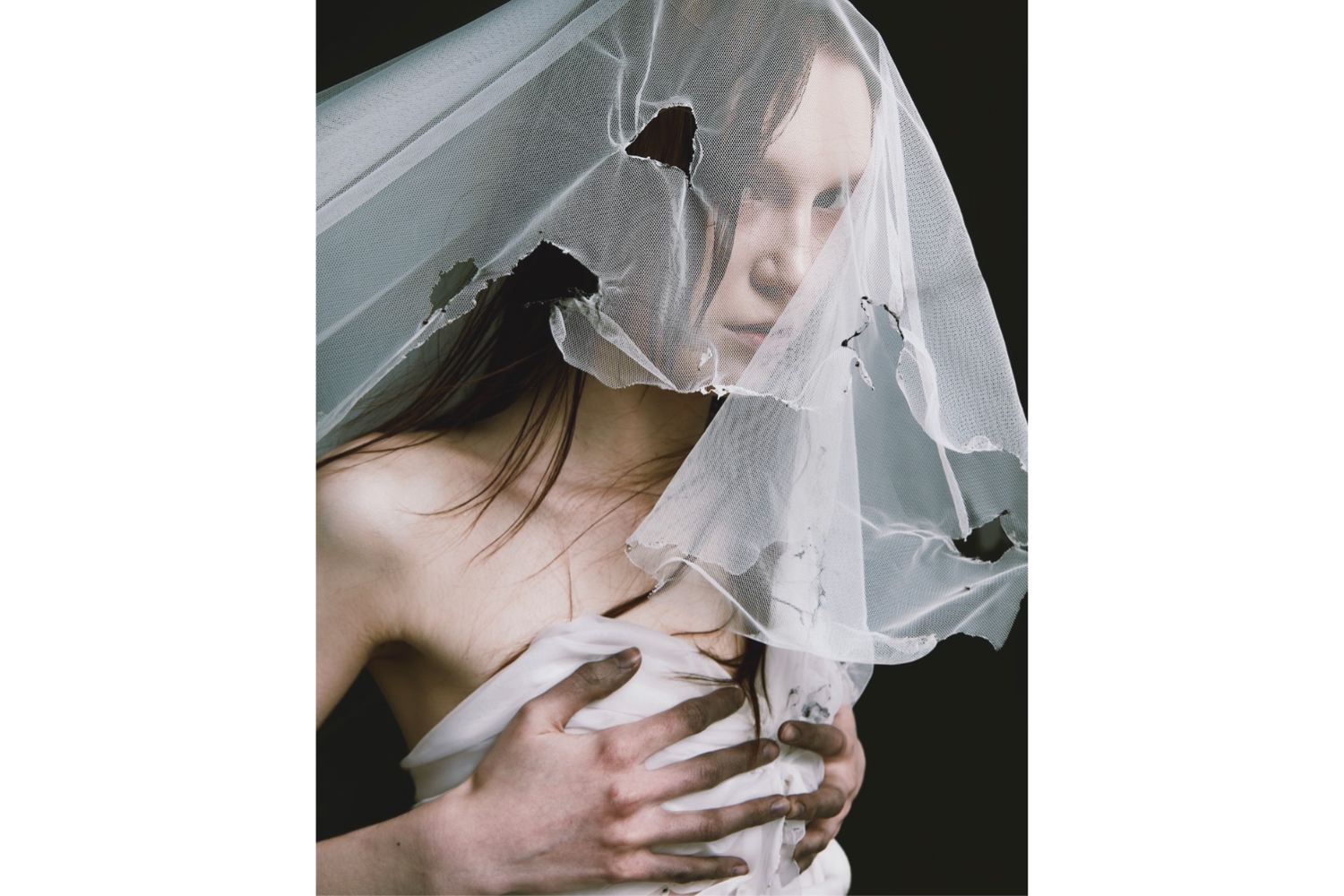 Обожженный тюль, бинты, хрупкие слои ткани и следы поврежденных материалов становятся метафорой того, что уже перегорело. Съемка проходила в студии с мягким пыльным фоном и минималистичной сценографией — пространством, которое балансирует между нервным срывом и полной апатией, когда эмоции уже не находят выхода. Ключевой образ — уникальное платье, созданное специально для проекта дизайнером Аленой Хохряковой.