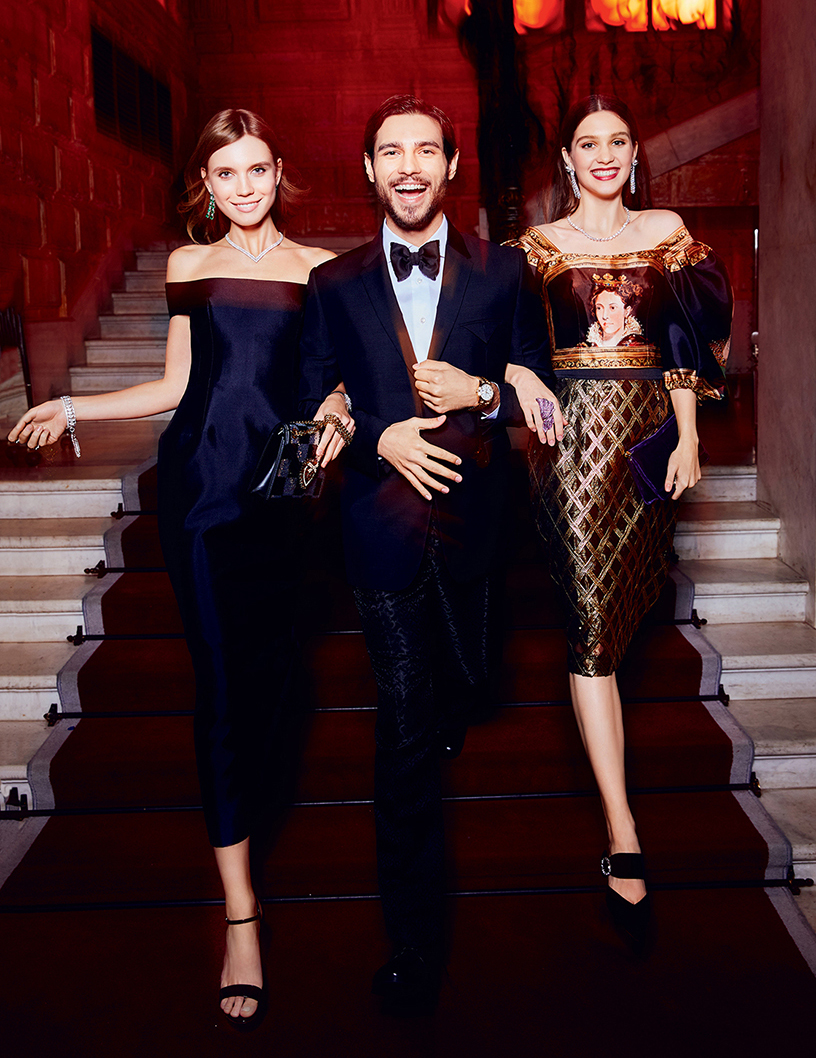 На Валерии (справа): топ Dolce & Gabbana; юбка Dolce & Gabbana; клатч Jimmy Choo; туфли Malone Souliers; серьги Graff; колье Mercury; кольцо Chopard.