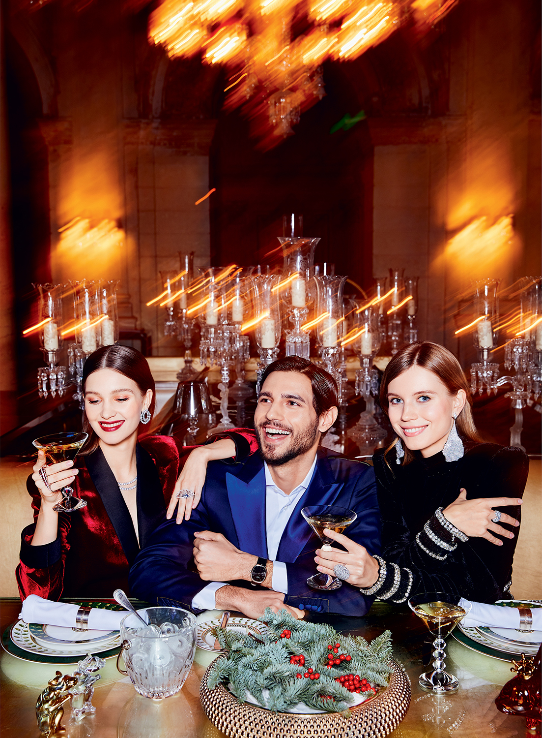 Бокалы для мартини Baccarat; сервировочная тарелка Constance Malachite; обеденная тарелка Bernardaud; салатная тарелка Bernardaud, тарелка для хлеба и масла Bernardaud; столовые приборы Christofle; блюдо на центр стола Christofle; ведро для льда Baccarat; скульптура «Мышь», Baccarat; скульптура «Золотая рыбка», Baccarat.
