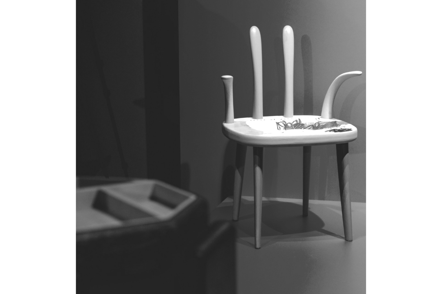Главным событием вечера стал показ экспонатов, созданных специально для VII Московской недели интерьера и дизайна. В экспозиции представлен светильник Studio «Светец», вдохновленный традиционным светцом. В современном исполнении он функционирует как стационарный торшер, а три переносных блока могут использоваться как отдельные источники освещения. Еще один экспонат — тумба-столик ODINGENIY «Артефактик» из вспененного бетона и полимеров.